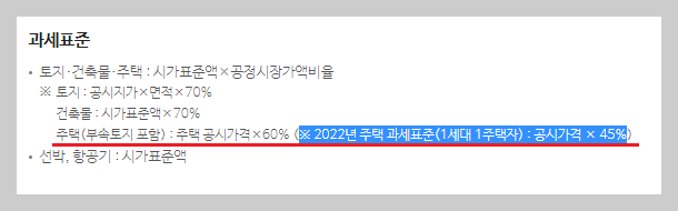 "주택"의 경우 공시지가의 60%입니다만, 단, 1세대 1주택자에 한하여 45% 입니다.