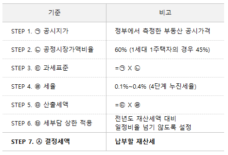 ㉢ 과세표준과 ㉠ 공시지가의 기준으로 각 구간별 세율에 따라서 계산합니다.