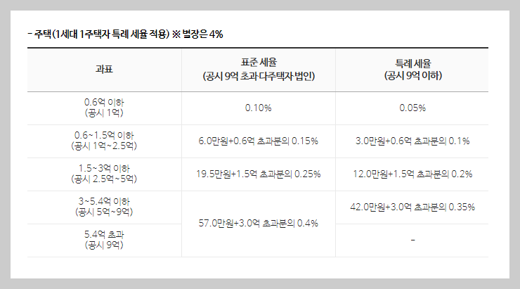 재산이 많을수록 세율도 높아지는, 구간별 누진세율(0.1% ~ 0.4%)을 적용하게 되는데, 다만 부동산 공시가격 현실화에 따른 세 부담 완화 및 서민의 주거 안정을 위해 공시가격 9억원 이하의 1세대 1주택자에 한하여 주택분 재산세 세율이 2021년부터 2023년까지 한시적으로 재산세율 과세표준 구간별 0.05%p씩 인하토록 하고 있습니다. (필자가 이에 해당됩니다.)